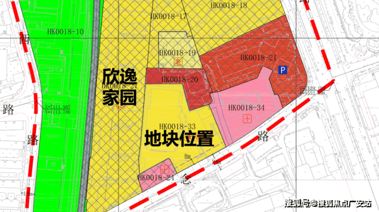 HK0018-33地块位于纪念路北侧,靠近逸仙高架路;地块形状不算规整,东侧紧邻HK0018-34地块,规划为社区医疗卫生用地;西侧是保留的现有住宅,欣逸家园。
