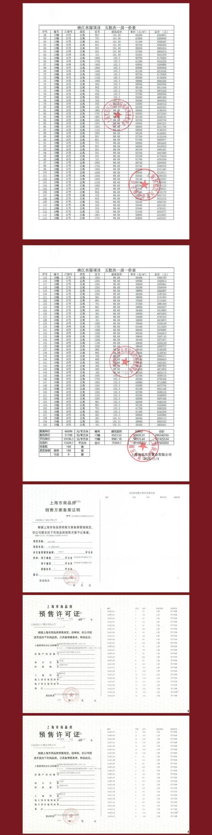 本资料为要约邀请,不作为要约或承诺,项目具体信息以政府最终审批文件为准; 项目周围环境、交通及其他公共设施的效果示意以实际落成或政府部门标准文件为准。 有关学区划分根据政府部门当年的划分为准,不作 为开发商的任何承诺。 相关宣传内容不排除因政府规划、规定及分期规划、未能控制等原因发生变化,在不违反法律法规、合同约定前提下,本公司有权对该宣传资料细节进行调整或更新。 预售证号: 闵行房管(2024)预字0000120号、闵行房管(2024)预字0000164号、闵行房管(2024)预字0000232号、闵行房管(2024)预字0000269号、闵行房管(2024)预字0000351号。 制作日期: 2024年11月19日。 开发商: 上海润泓江川置业有限公司; 备案名: 映江名邸 ; 营销推广名: 映江润府☮🔥华润映江润府售楼处电话:400-8787-740👈🔥