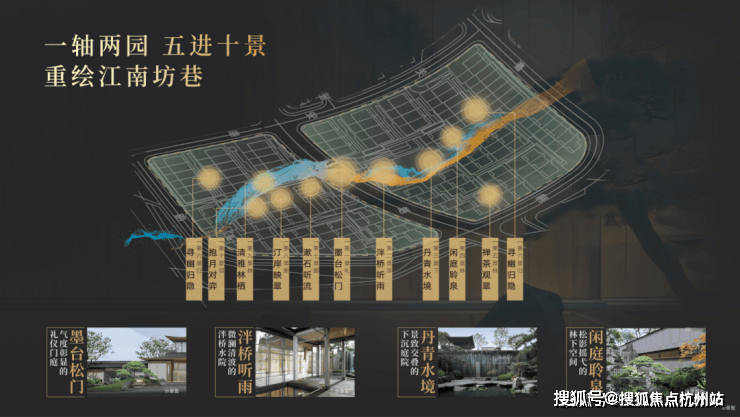 园林设计上依据“一轴两园五进十景”规划,以豫园造景手法为基础,提取楼阁、折桥、墨池等中式元素,构建立体山水,重绘江南坊巷。