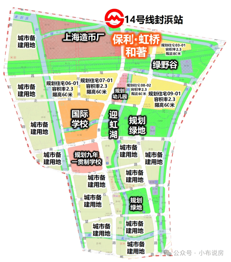 轨交:地块与地铁14号线终点站封浜站的直线距离不到500米,坐一站到乐秀路,未来可以换乘嘉闵线(在建),连接大虹桥、七宝、春申等板块。