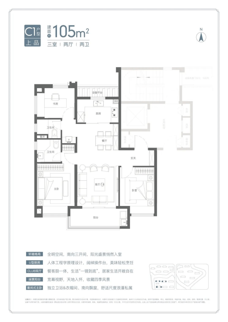 U型厨房、餐厅、客厅、阳台一线联通,南北通透。主卧套房、全卧飘窗、次卫干湿分离也都是标配。