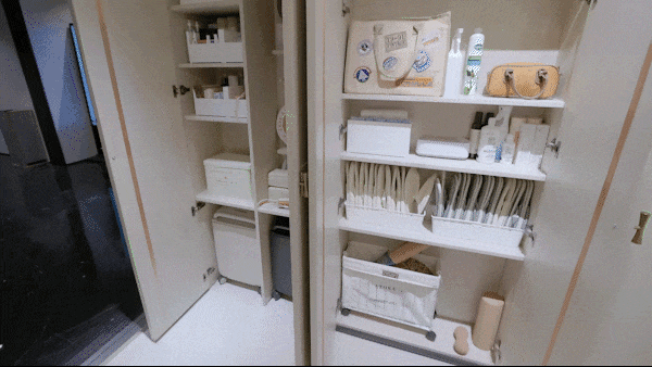 配合抽拉置物架、地柜联动拉篮、天使下拉拉篮、三重骑马柜、随心抽、窄柜高深拉篮的组合拳,每一种都像是为不同的物品量身定制。