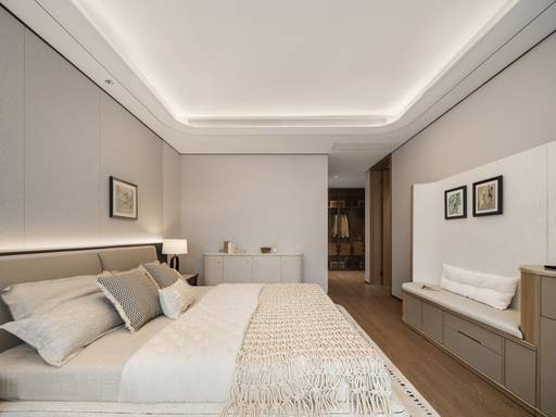 主卧:L 型超大衣帽间、双台盆卫浴、270° 转角飘窗、干湿分离。