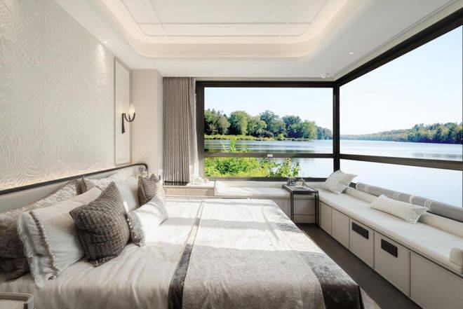 270°转角飘窗,把不同角度的阳光和风景都框进来,阳光洒满整个窗台,外面的景色一年四季都在变,每天看到的画面都不一样,特别有生命力。