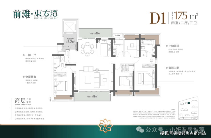 户型建筑层高3.1-3.15米,无连廊,双阳台配置。其中建面约103平户型2梯2户,其余一梯一户。