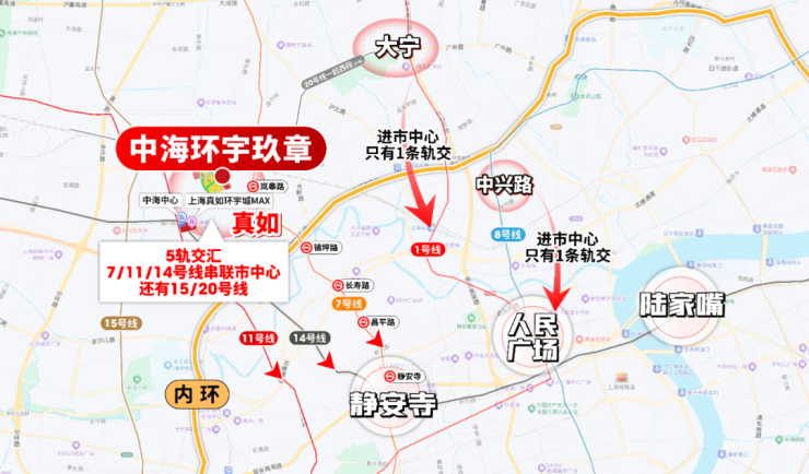 有位从南京西路过来的客户算了笔账:从中海环宇玖章到南京西路仅需5站,他同时在对比中兴路和大宁新房,最后直言“真如的交通效率就是王炸”——4站就能到静安寺,光进市中心的轨交就有三条;而中兴路板块只有8号线,大宁也仅靠1号线支撑,对比之下,真如的交通便捷度无可替代。