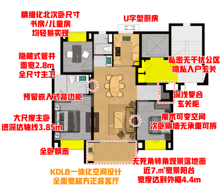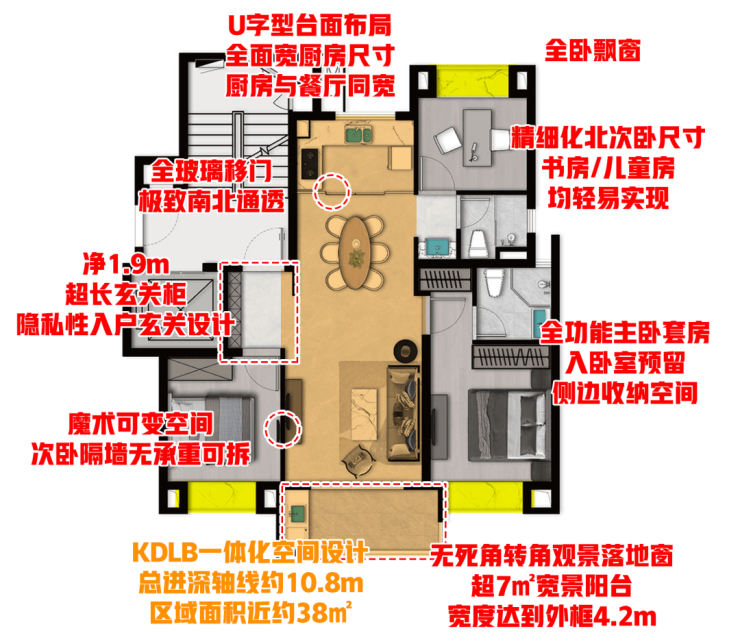 入户玄关及超大玄关柜设计,三开间朝南飞机户型, KDLB一体化设计,客厅次卧魔术可变空间,U型厨房,大尺度宽景阳台+转角观景落地窗,舒适北卧,三段式干湿分离客卫,全卧室飘窗,等等