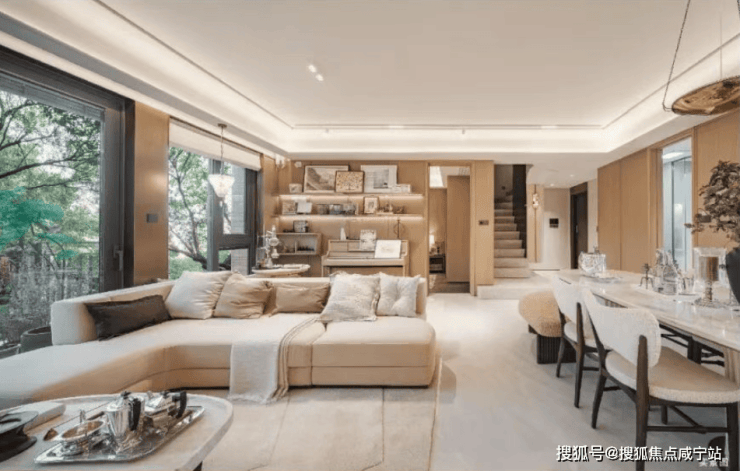 客餐厅、南向次卧、独立主卧层层配享同等尺度面宽,充分将全天日照最大限度地纳入室内。巨幅落地玻璃窗如同取景框,将庭院绿意无缝衔接入内,最大化确保了每位家庭成员都能平等地享有阳光与观景的权利。