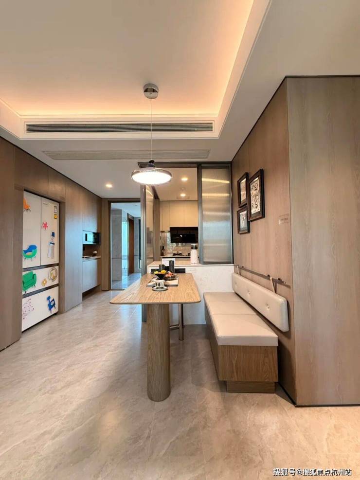 LDKB一体化设计。通过金属玻璃移门和岛台联动,达成餐厨一体,增加家庭成员互动。烟道外置以及S墙内嵌设计,优化空间布局,提升台面使用感和转角柜使用频率。