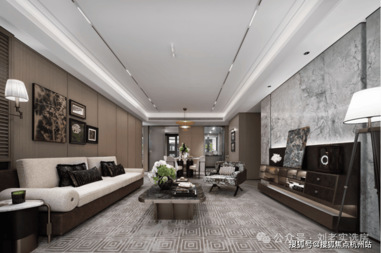 双大堂系统则将尊崇感贯穿于归家动线的每一程。社区主入口大堂以酒店式的空间尺度与艺术化陈设,完成从城市到社区的过渡;单元入户大堂则进一步将仪式感升华,精选雪山飞狐、高山流水等珍稀奢石作为主背景,天然形成的山水纹理宛如艺术画卷。搭配精心设计的艺术吊灯与金属细节,营造出兼具归家温馨感与艺术馆般精致度的“第二客厅”。从公共到私属,双重大堂不仅实现了功能分区,更通过材质与光影的层层递进,完成了情绪上的铺垫与升华。