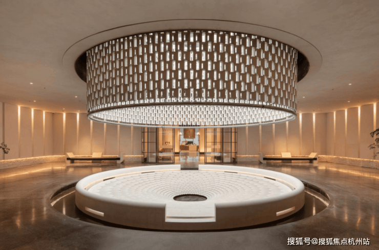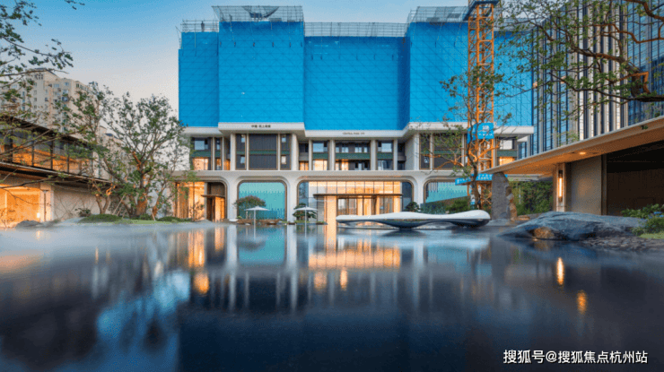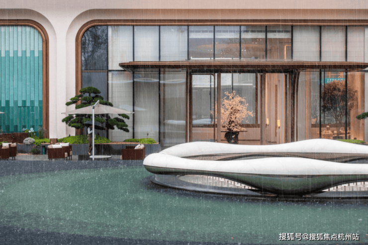 浮光池院水院会客厅 ,现已实景呈现,水景中央的艺术小品,如一滴水在湖面晕开,泛起阵阵涟漪。