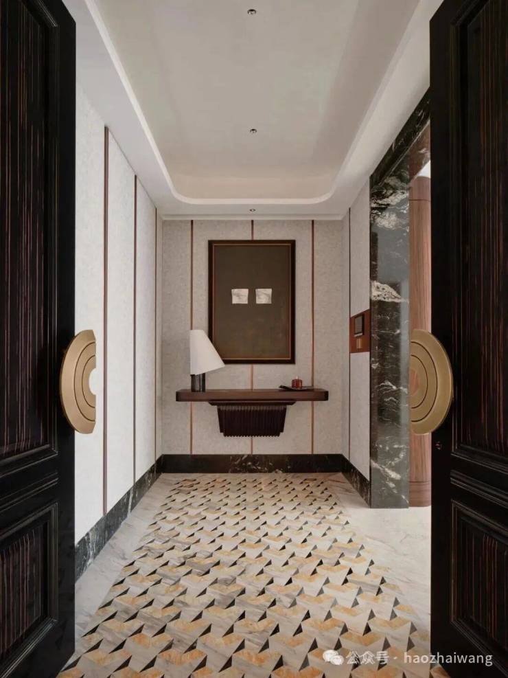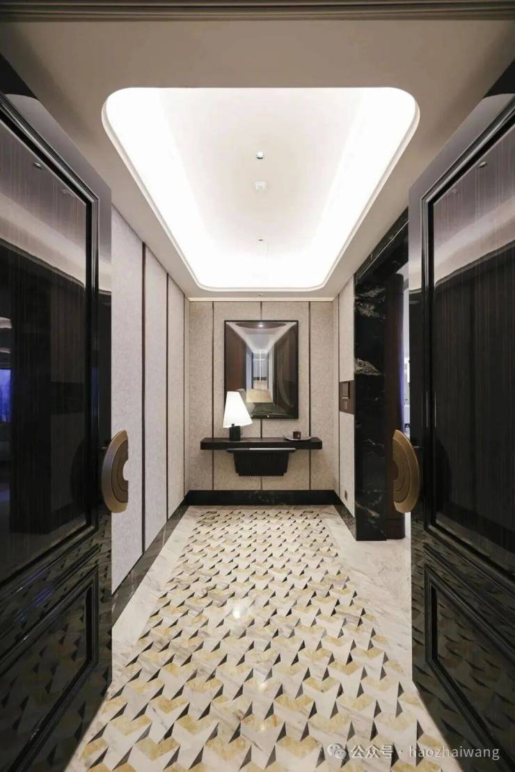 室内石材均由【英国皇家豪邸御用设计专家」的1508 London亲自挑选,在铺装前采用工厂预铺方式进行对纹编号,保证整体色泽纹路一致,每一处空间都精心带来不同的石材拼花。