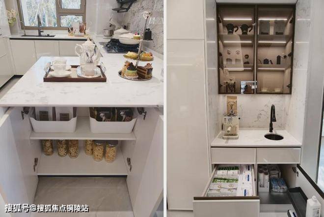 食品库在厨房里,吊柜里的小家电收纳区、折叠置物架、升降拉篮、手动吊柜拉篮……全给你安排得明明白白。岛台内部藏着“隐藏式”小推车和拉篮,外侧还有专门的收纳格。