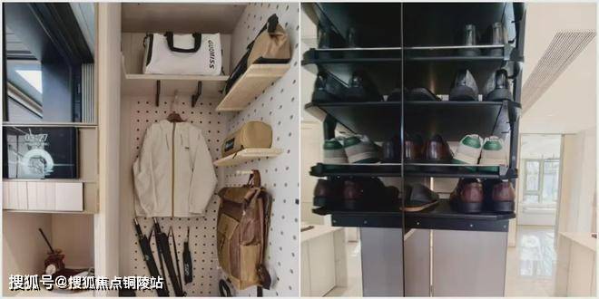 进门玄关处有个800库,深约800mm,路亚箱、滑板、行李箱,随便往里塞。连洞洞板都是交付标准,未来可以自由分区。旁边还配了个可抽拉鞋柜,至少放得下40双鞋,一家三口的鞋全放进去,空间还能有富裕!