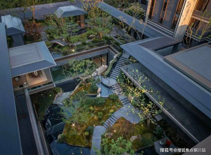不同于传统围墙分隔,小高层与叠墅区之间,被一条中央景观绿轴温柔区隔——溪流蜿蜒、桥影点缀,水声与光影在绿意间悄然流淌。