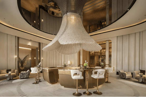 会客厅不仅承载了“私人空间之外的延伸场景”,还打造了标志性的“羽化万象”艺术吊饰,每一片玻璃羽毛造型都由经验颇丰的老师傅搭建而成,构建出光影婆娑的美学画卷。