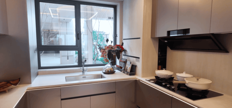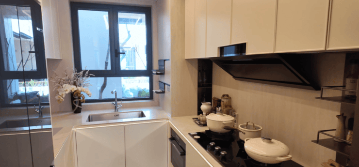 相比保利天奕每个卧室空间体感会更好,这个户型厨房选用的是博世油烟机、三眼燃气灶、嵌入式蒸烤箱,包括玄关柜和餐边柜也是交付范围内。