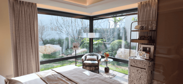 外立面采用仿石铝板+大比例玻璃,在加速老化的唐镇次新房中还是很有竞争力的。