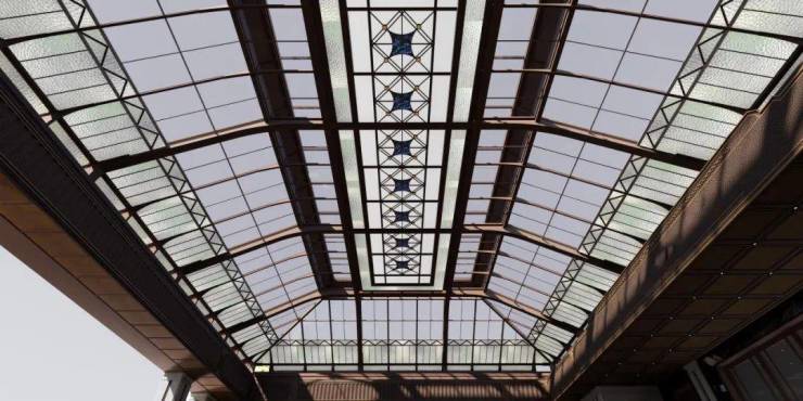 继续向里走,廊道内可见经典的石材立柱、拱形的吊顶、PRADA荣宅的手绘彩玻、繁花的地面拼花等用材工艺,移步异景间,是别样的摩登魅力。