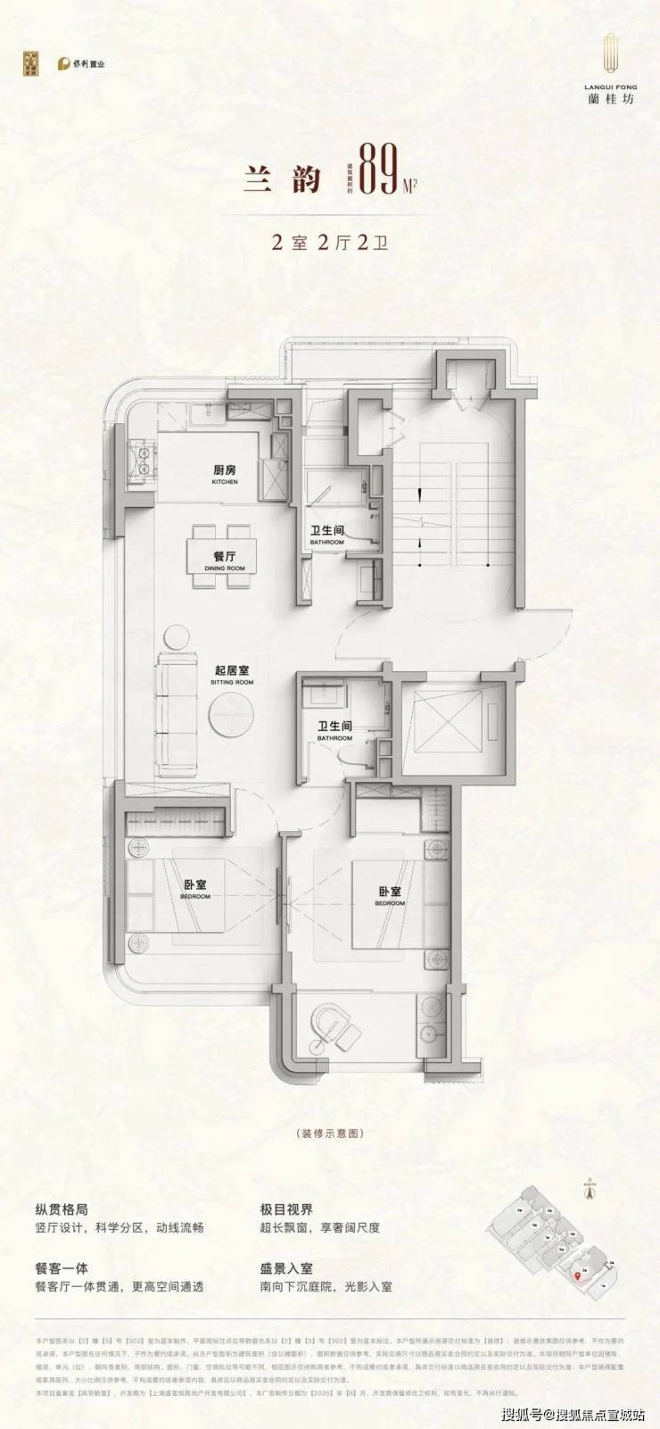 洋房:建筑面积约 89-180㎡,主力户型为 3 室 2 厅 2 卫或 4 室 2 厅 2 卫,全三房或四房设计,三开间朝南,LDKB 一体化空间(客厅、餐厅、厨房、阳台连通),主卧套房带飘窗。
