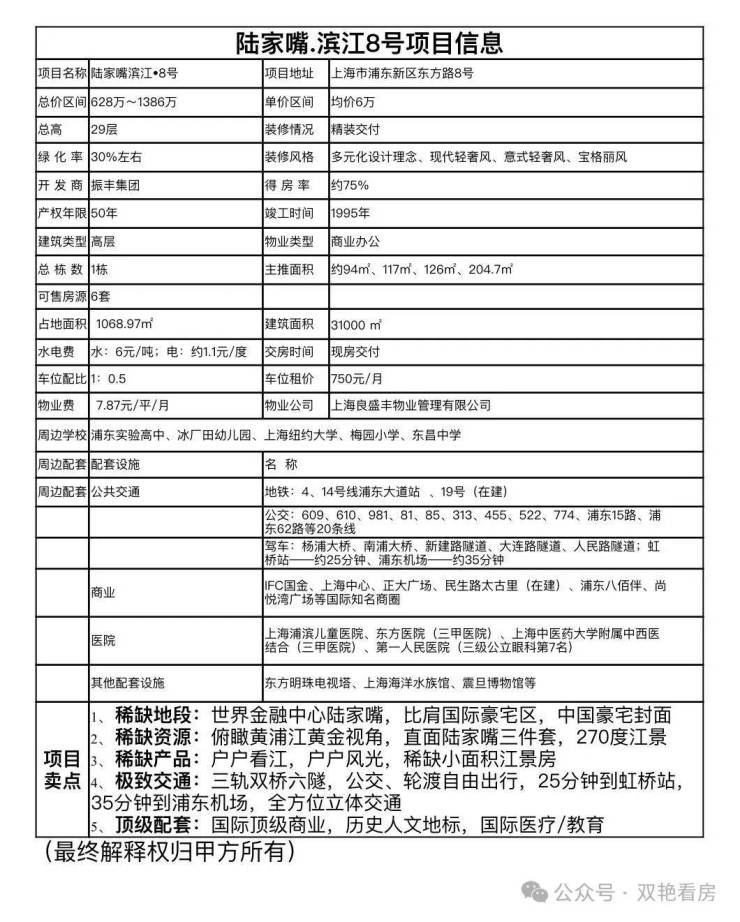 滨江8号售楼处预约电话:400-9955-415☎️☎️✅✅✅【售楼热线】✔✔✔营销中心热线☎400-9955-415☎️☎️✅✅✅售楼处地址☎400-9955-415☎️☎️✅✅✅(良丰大厦)坐落于上海市浦东新区东方路8号,地处陆家嘴金融贸易区核心地段,距黄浦江仅约100米,是陆家嘴稀有的塔尖公馆。项目总高29层,层高3米,梯户比4梯8户,得房率约75%,产权年限50年。主力户型为建面约87-126㎡的精装公寓,总价约568-778万,均价6万/㎡,装修标准5000元/㎡。