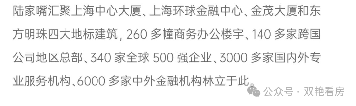 陆家嘴汇聚上海中心大厦、上海环球金融中心、金茂大厦和东方明珠四大地标建筑,260多幢商务办公楼宇、140多家跨国公司地区总部、340家全球500强企业、3000多家国内外专业服务机构、6000多家中外金融机构林立于此。
