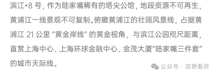 项目地处上海陆家嘴金融贸易区,近江约100米。陆家嘴被誉为中国的华尔街,更是上海的金融中心、经济中心和贸易中心,是全球金融中心,陆家嘴金融城,与纽约华尔街、伦敦金融城并称为世界三大金融中心,陆家嘴滨江,也成为并肩纽约中央公园、伦敦海德公园的顶级资本豪宅区,成为世界豪宅的中国封面。