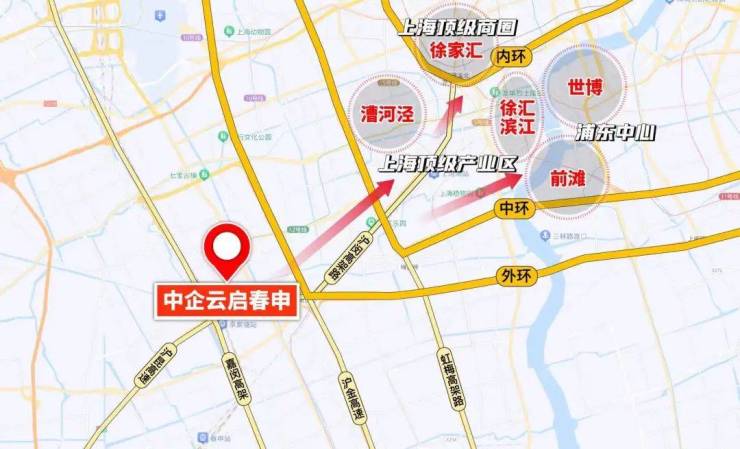 往北是七宝虹桥、往西是漕河泾、徐家汇、徐汇滨江、前滩世博浦东主中心,往南是颛桥、紫竹、往西是G60科创走廊。