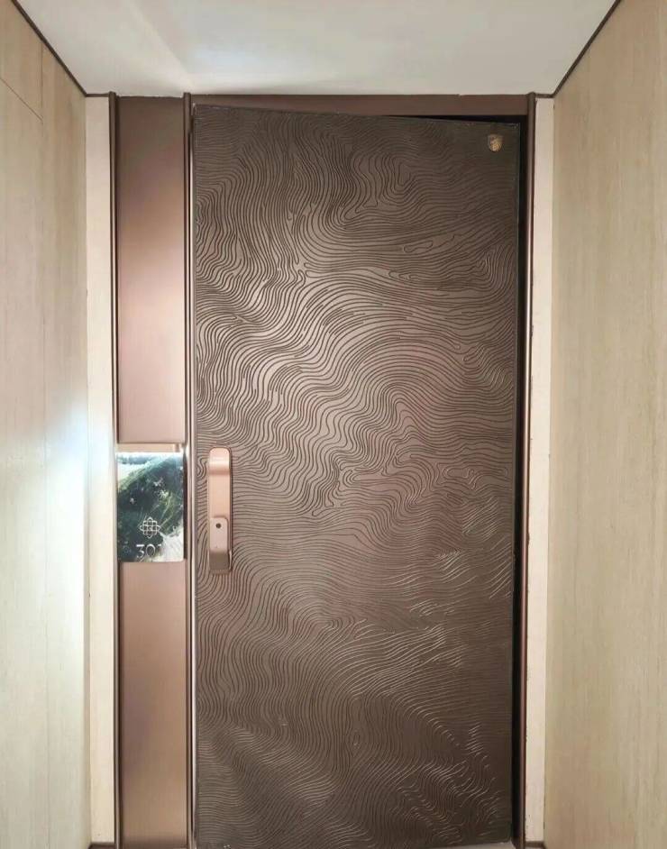 实景电梯厅铺设梵高印象岩板,电梯轿厢选用冷翡翠大理石。