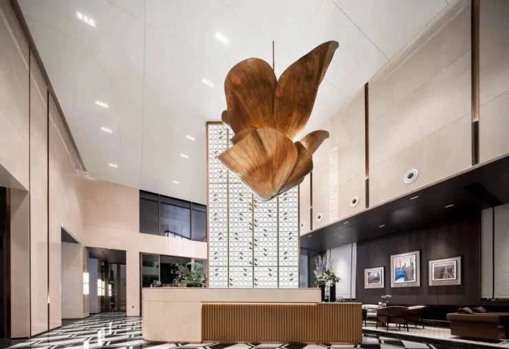 双归家大堂的地面采用香格里拉黑通铺,墙面选用奥特曼米黄,背景墙则以莫奈花园大理石呈现。