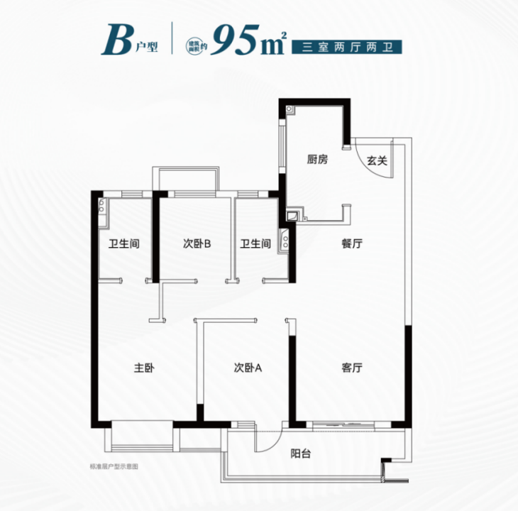 建筑面积约95㎡三房:双卫+南北通主卧,南向面宽近10米,预留岛台改造空间,可做到“二胎不换房”。