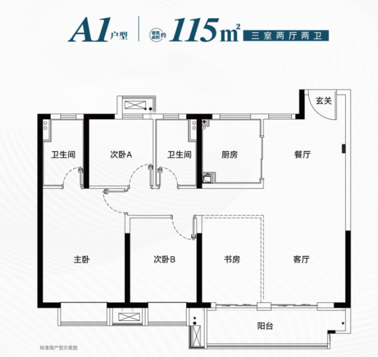建筑面积约115㎡四房:四开间朝南+LDBK大厅堂设计,面积和总价控制很优秀,是板块内“改善优等生”。