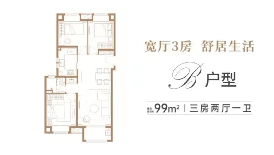 建面约99㎡B户型图,3房2厅1卫