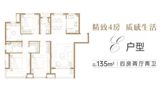 建面约135㎡E户型图,4房2厅2卫