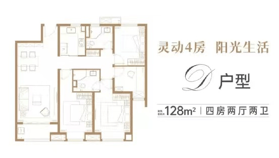 建面约128㎡D户型图,4房2厅2卫