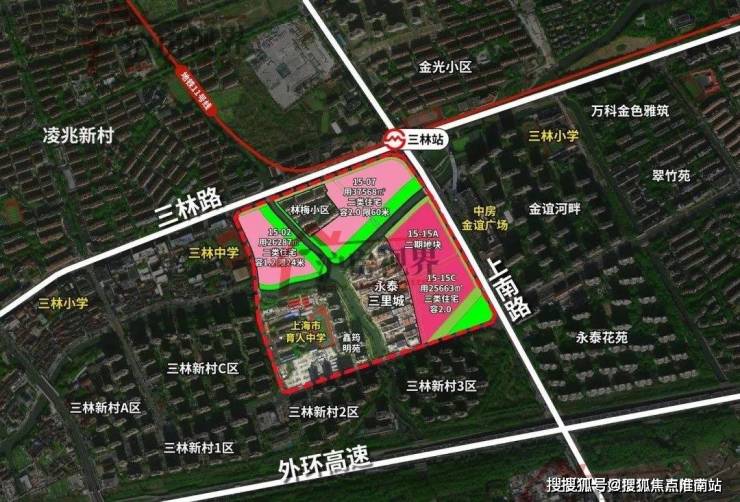该地块为三林镇金光村“城中村”改造的重点项目,紧邻地铁11号线三林站,规划一条12米宽公共步行通道,连接社区与地铁站;同时周边有中房金谊广场、三林中学、东方医院等生活配套。