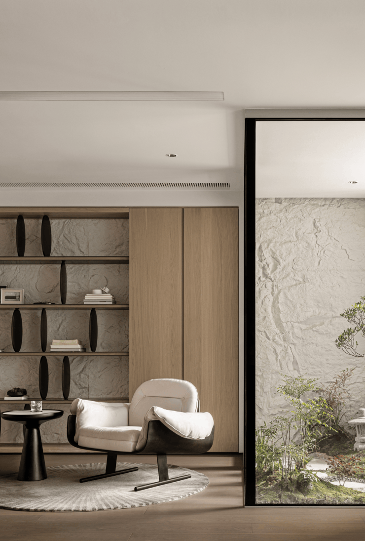 实景示范区,端景转角迎客松与中国黑原石构景,充满禅意。景观种植也很丰富,有从山东精选的油松,造型榔榆树,每一棵都都挺拔如画。