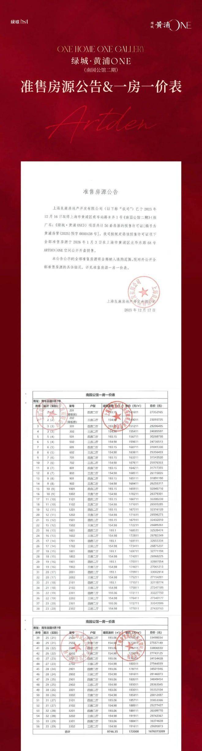据悉【绿城黄浦ONE】二期加推建面约155-193㎡3-4房(高层),均价17.2万/㎡,总价约2300万起,收官56席,不容错过!项目接待中心持续开放中,样板间已开放!