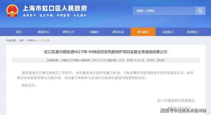 虹口区嘉兴路街道hk270B-04地块历史风貌保护项目实施主体遴选结果公示,终确定由上海市漕河泾新兴技术开发区发展总公司(临港集团)及杭州燚乐实业投资有限公司(越秀)联合开发。