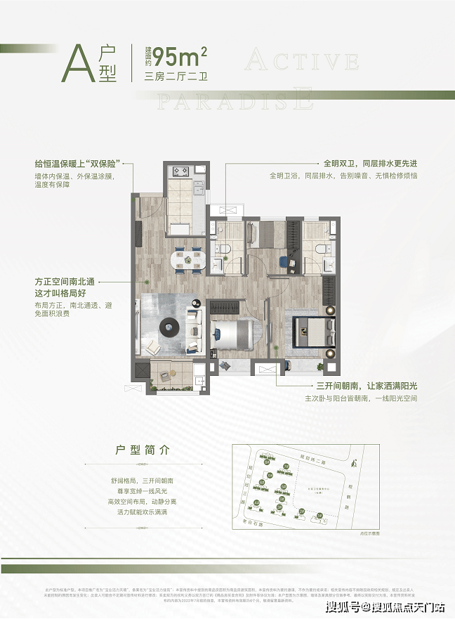 约95平三房两厅两卫,做到了三开间朝南+主卧套房设计+南北通透+动静分离+双朝南卧室带飘窗,是非常棒的3房户型!