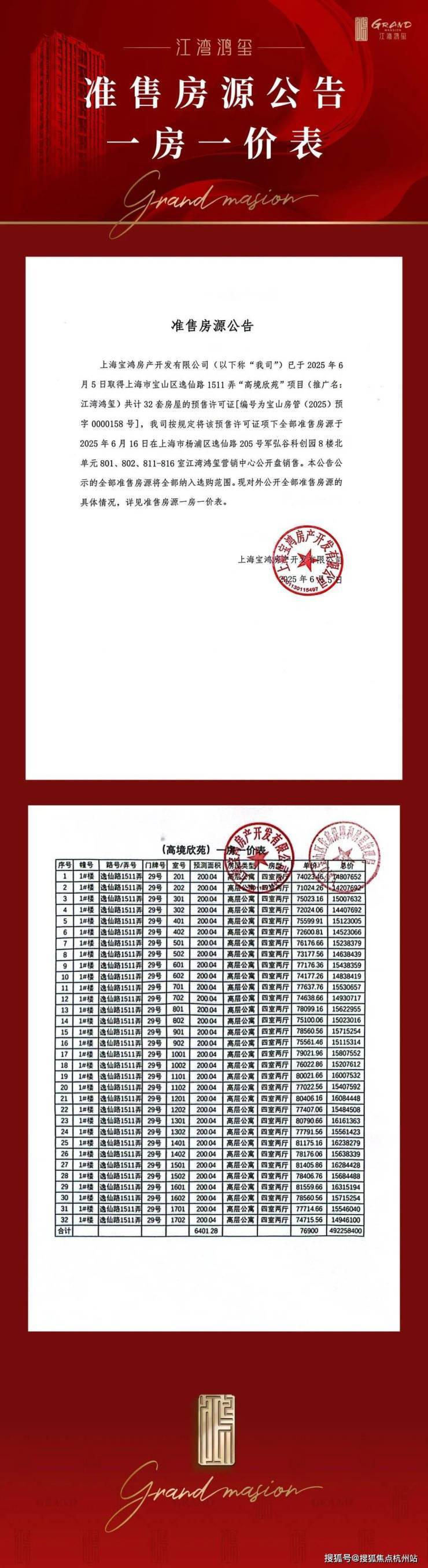 上海中环旁、四轨环绕 江湾鸿玺今日正式开启认购,一房一价表发布: