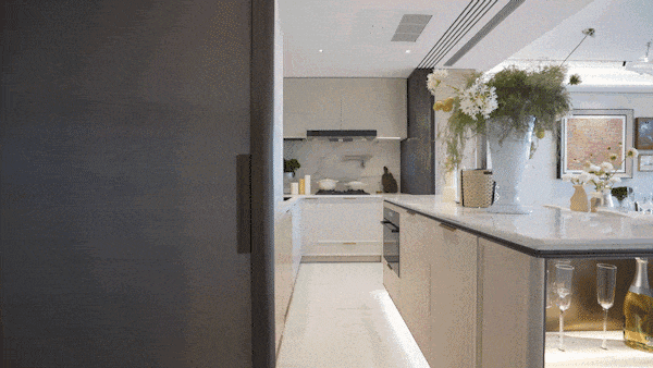厨房,迎面而来的是一整套嘉格纳(Gaggenau)厨电——从三眼灶、油烟机、洗碗机、内嵌冷冻/冷藏冰箱、蒸烤一体机,每一样都精准呼应着顶级豪宅的身份标签。