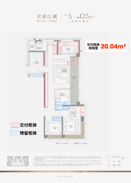 收纳系统同样精心考量,边套户型交付含柜体及预留位置,总体收纳容积约达20.04m³,中间套亦可实现约16.56m³,充分满足了日常储纳需求。(数据仅供参考,最终以实际交付为准)