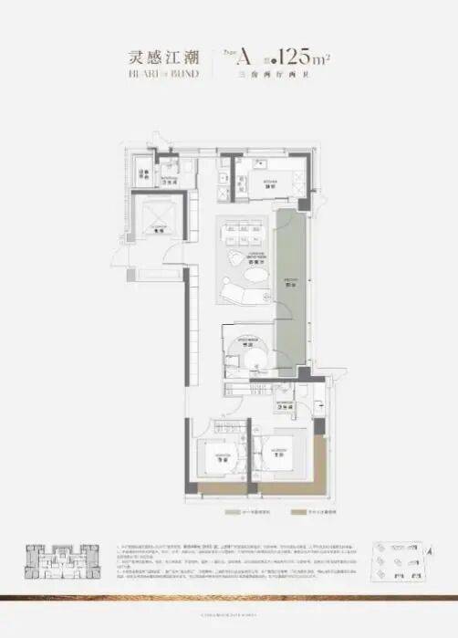 建面约125㎡边套A户型,创新打造了约6米宽厅,并可将仅计一半面积的阳台完全纳入客厅范围,显著拓展了实际使用空间,带来开阔明亮的居住体验。