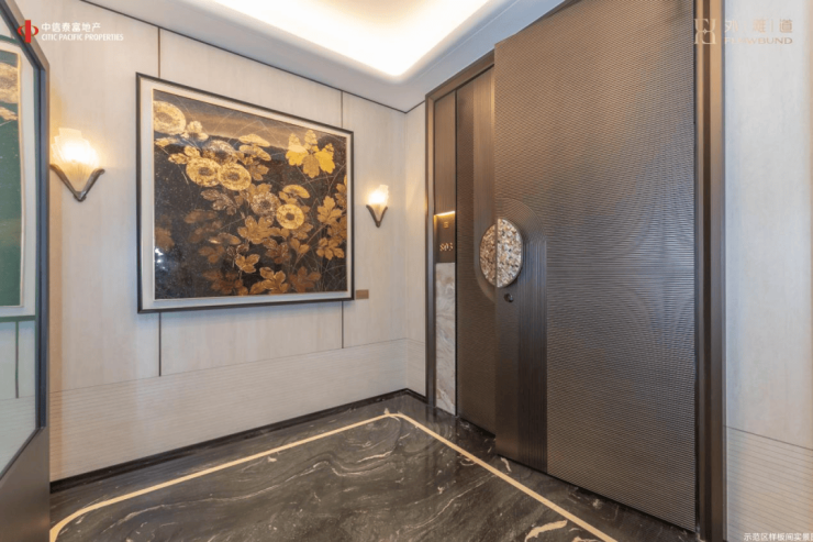 私密的本质,是空间对身份的认证。外滩道以“一梯一户”为起点,通过约6.5㎡独立电梯厅与独立玄关,构建双重空间缓冲:电梯厅承接社交往来,玄关收纳尘世琐碎。东向整面墙的收纳系统,让归家成为一场从喧嚣到宁静的身心过滤。