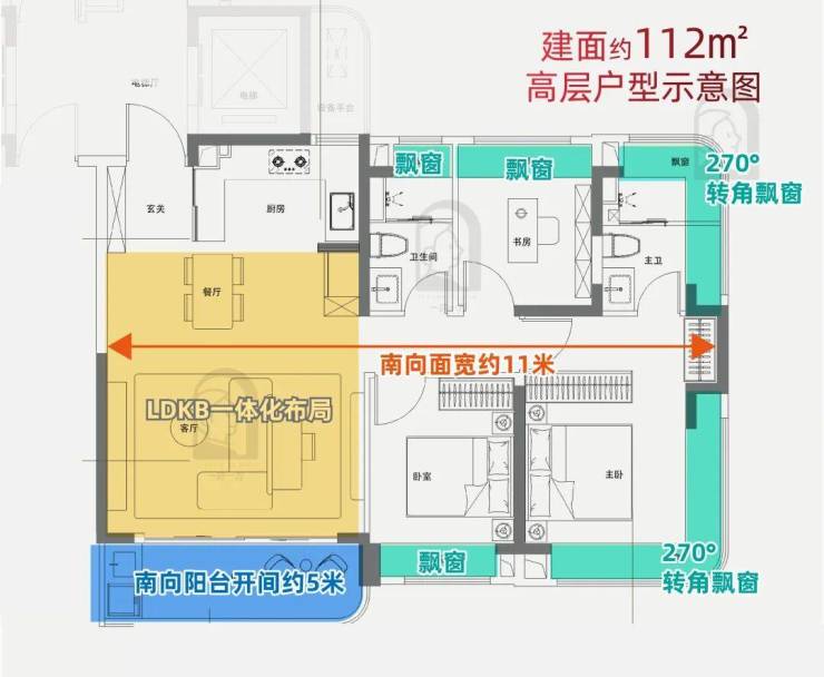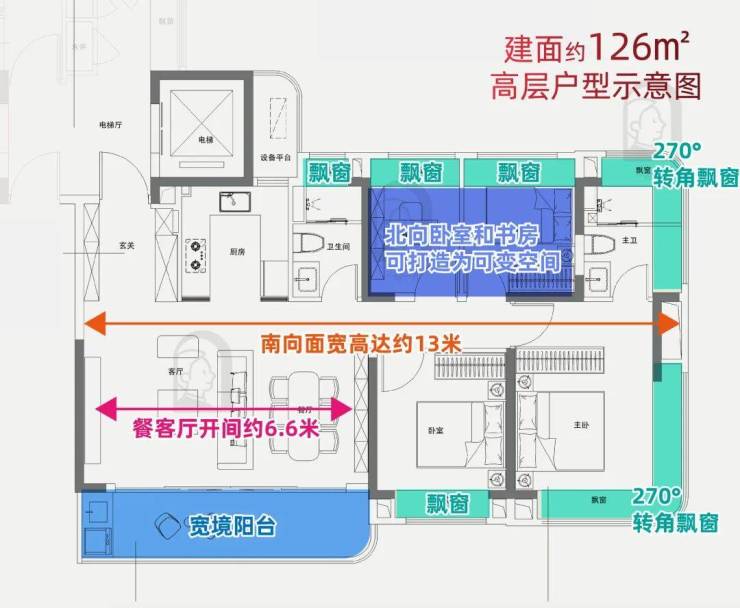主卧还做了两大270°转角飘窗,这在同面积段户型中极为罕见。