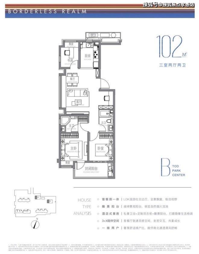 建面约102m²户型特点:LDK洄游式景观边厅,景致拉满,3+X陪伴空间,承载更多自定义功能需求,开放式厨房,烹饪与客餐厅无界互动。