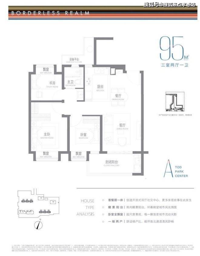 建面约95m²户型特点:开放式厨房,极度释放厨房与客厅的尺度与互动可能,无连廊设计,一梯两户极致梯户比,南北通透舒适感