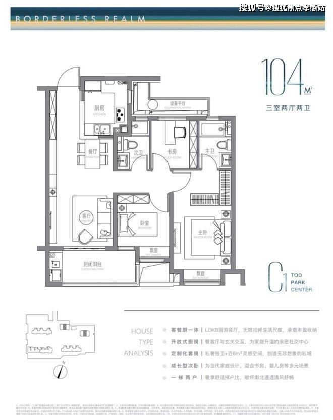 建面约104m²户型特点:LDKB洄游式竖厅+开放式厨房,生活尺度无限拉伸,主卧近6m²灵感空间,承载更多功能可能,成长型的次卧,书房儿童房随心所欲。