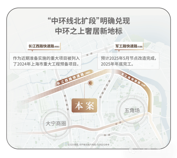 中环线北扩段明确兑现,军工路快速路25年开工,长江西路快速路列入上海市重大工程清单预备项目,快速链通城心,随着中环线北扩段的政策明确,淞南将正式进入中环时间。未来经逸仙高架,进入南北高架、内环高架、中环高架,可快速链通南北上海;多维立体路网全面升级,未来区域价值再攀新高。